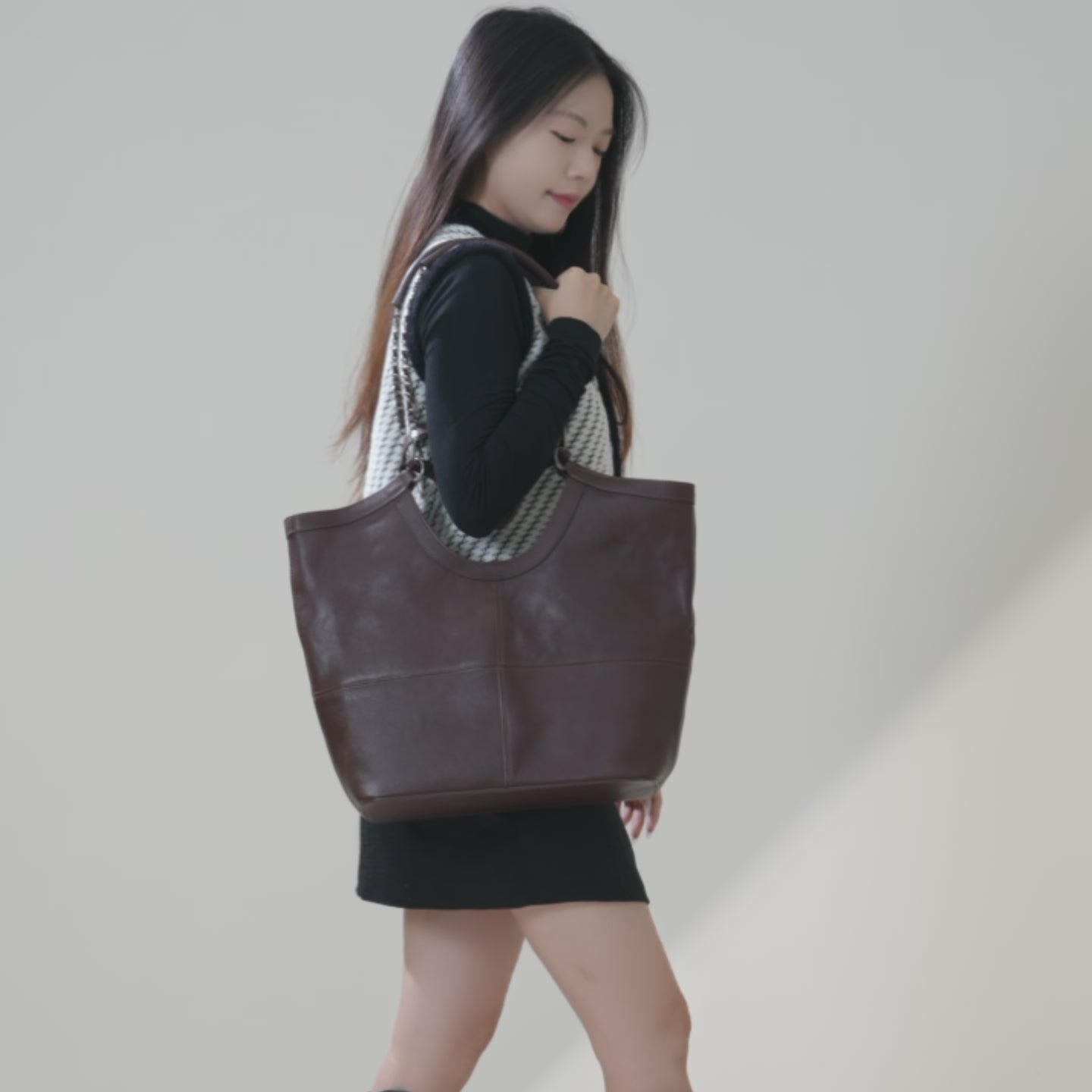 Defined by its sculptural concave silhouette, this wholesale tote bag features a sophisticated magnetic closure, a detachable leather pouch, and a distinctive U-shaped ring handle accented with a chain detail. Designed for versatility, it offers two carrying options—handheld or over the shoulder—adapting seamlessly to any occasion. Inside, a zippered pouch provides secure storage for essentials such as toiletries or valuables, while the leather stitching adds a touch of understated craftsmanship.